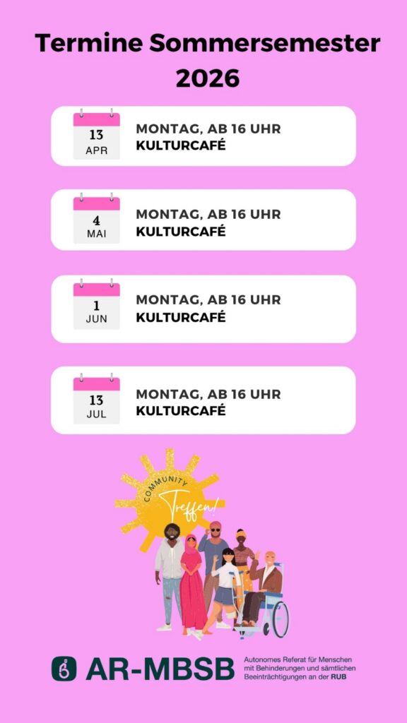 Alle Studierenden der RUB mit Behinderungen, chronischen oder sonstigen Beeinträchtigungen sind herzlich eingeladen, teilzunehmen und mit abzustimmen.
